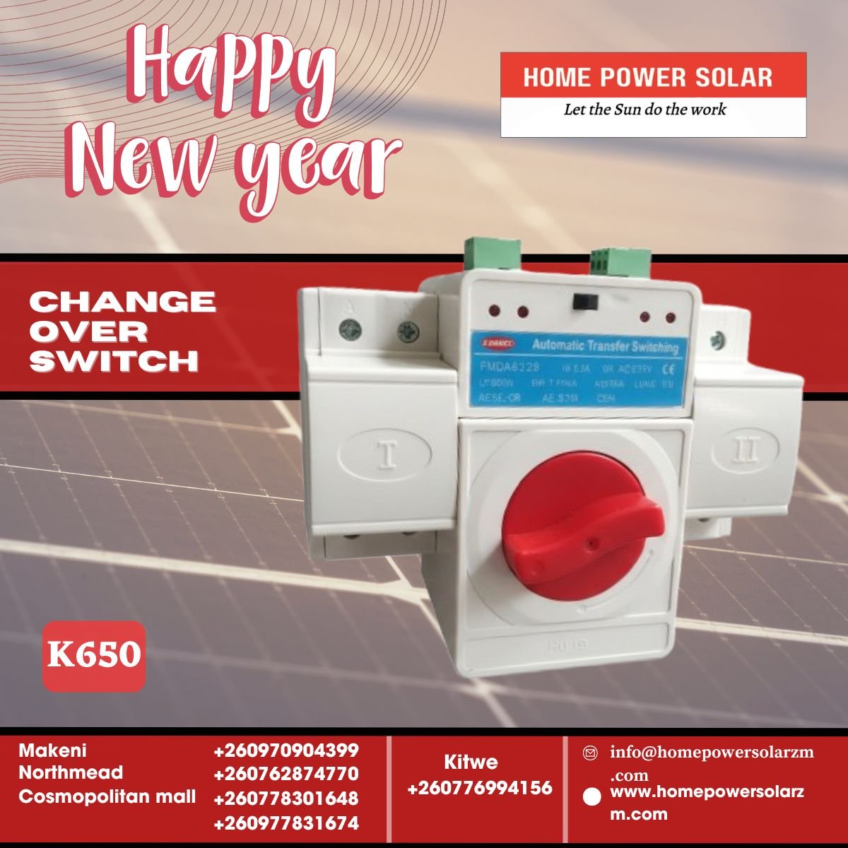 Automatic transfer switch seamlessly switching between solar/battery power and ZESCO grid supply, ensuring uninterrupted power flow for your home or business.